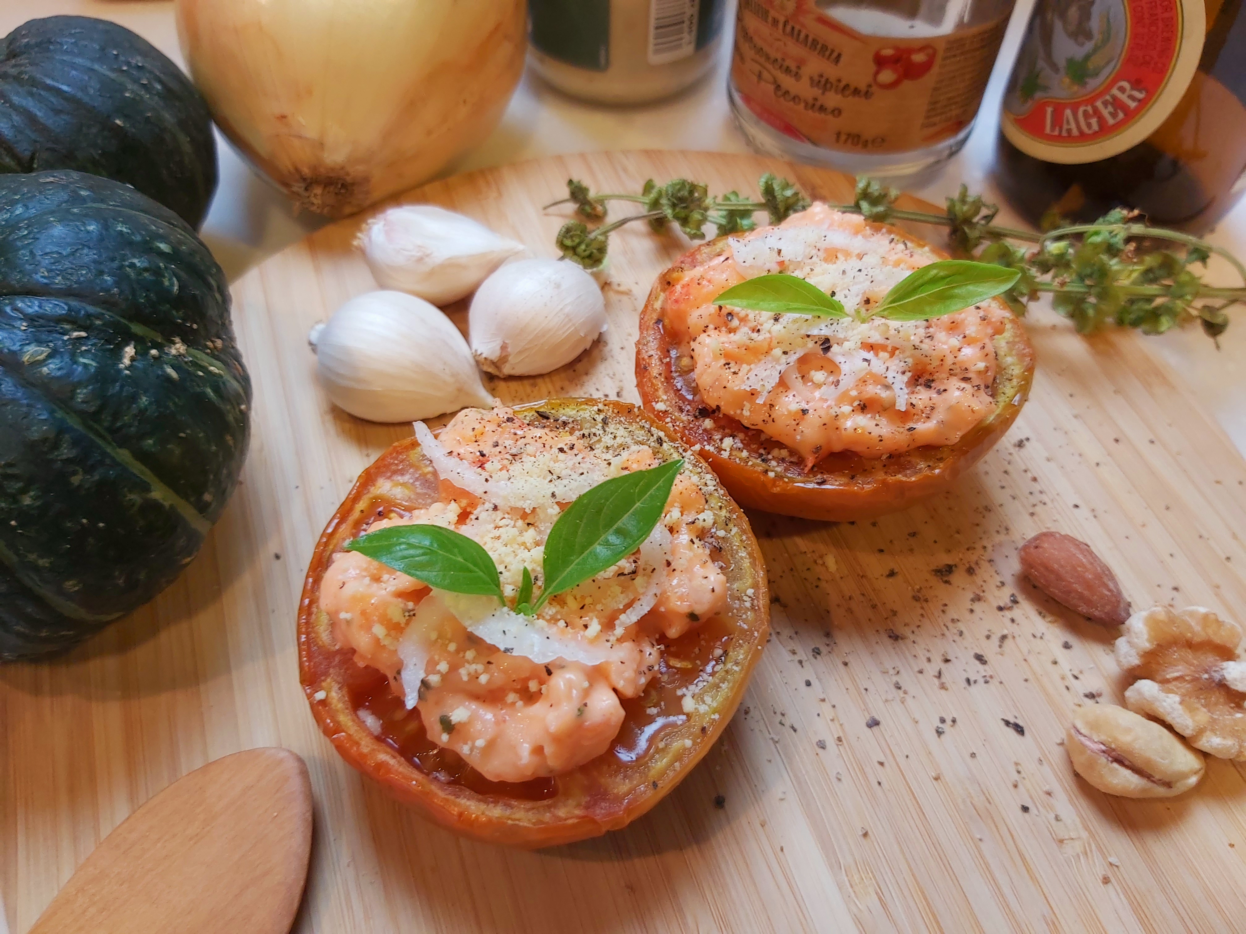 番茄洗淨,對半切進入烤箱烤10分鐘,出爐後擠上龍蝦沙拉並放上一點生洋蔥,就是一道爽口的開胃前菜。小心茄汁燙口,烤得軟透的番茄和龍蝦沙拉的組合,絕對是最合適的拍檔!​ ​ ​